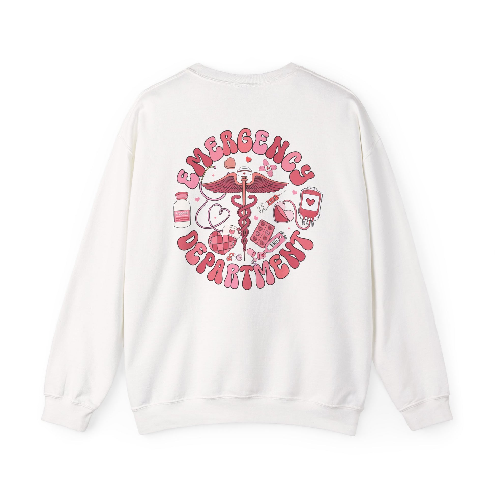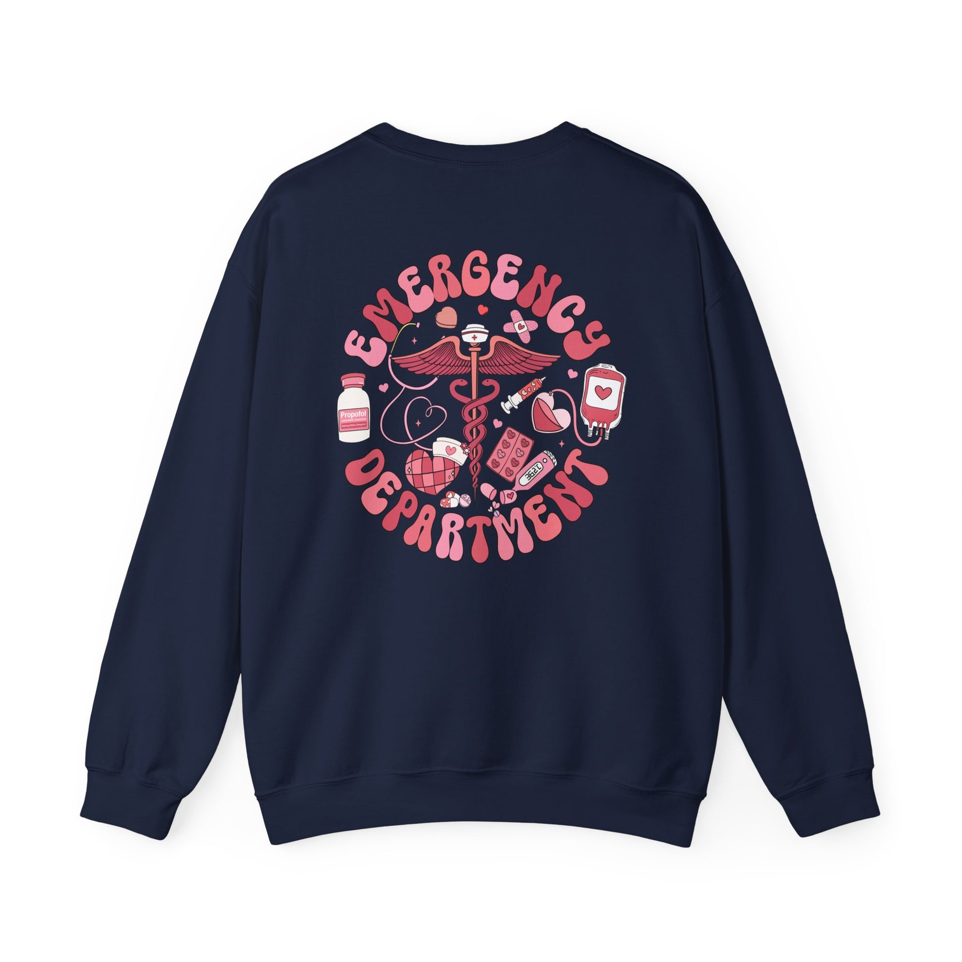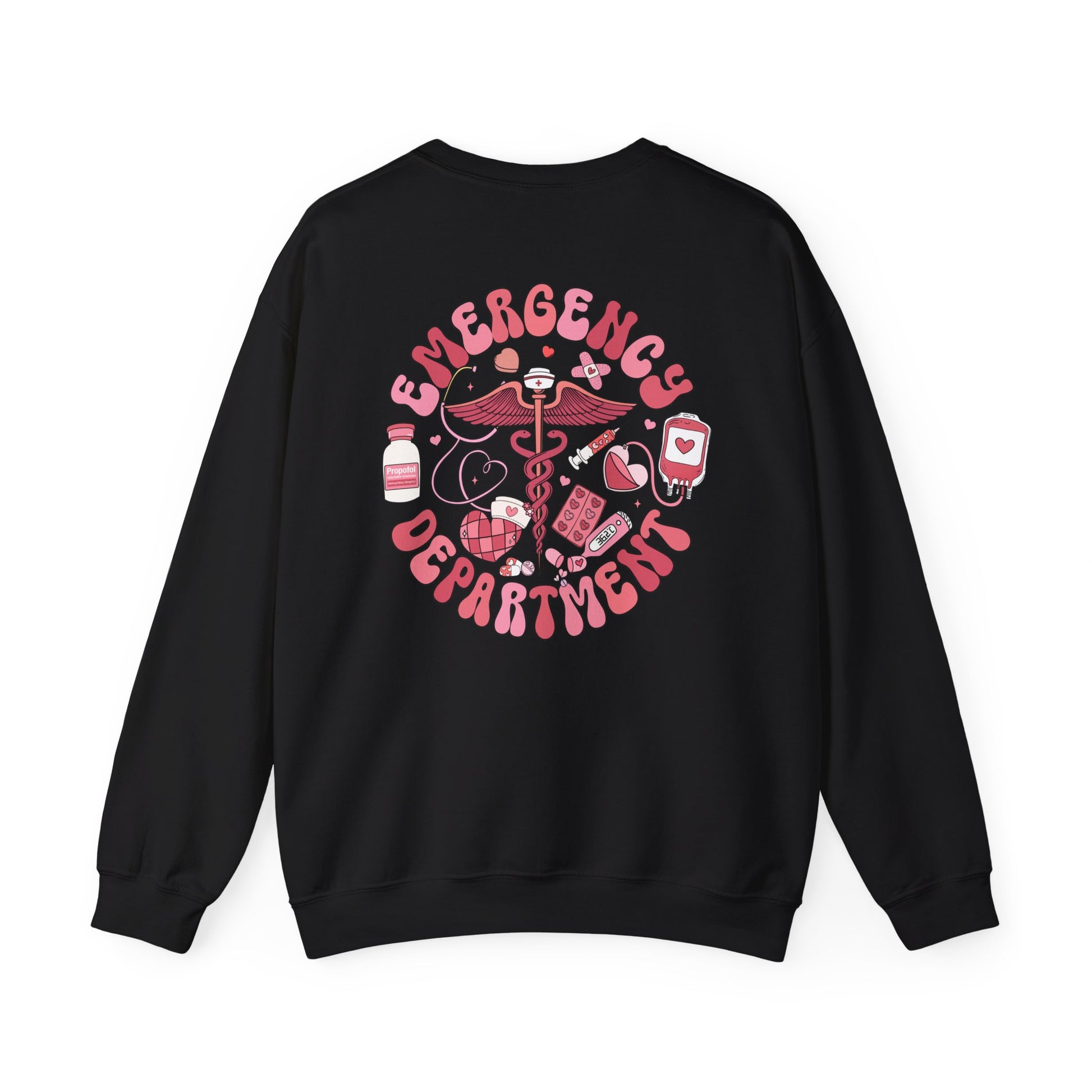 Soft, lived-in comfort meets playful emergency-room pride. This crewneck settles in like a warm pause at the end of a long shift — roomy across the shoulders, cozy at the cuffs, and light enough for layered mornings. The back shows a cheerful, retro-inspired Emergency Department motif in pink tones; the small chest embroidery echoes that same vibe for a subtle nod when you’re on the move. Durable double-needle stitching and a tear-away label keep it comfortable through rounds of wear and wash. Whether you slip it on after a night shift, wear it on rounds between clinics, or gift it to a colleague who understands the rhythm of the floor, it carries a soft, human energy that honors the work without shouting it out loud.