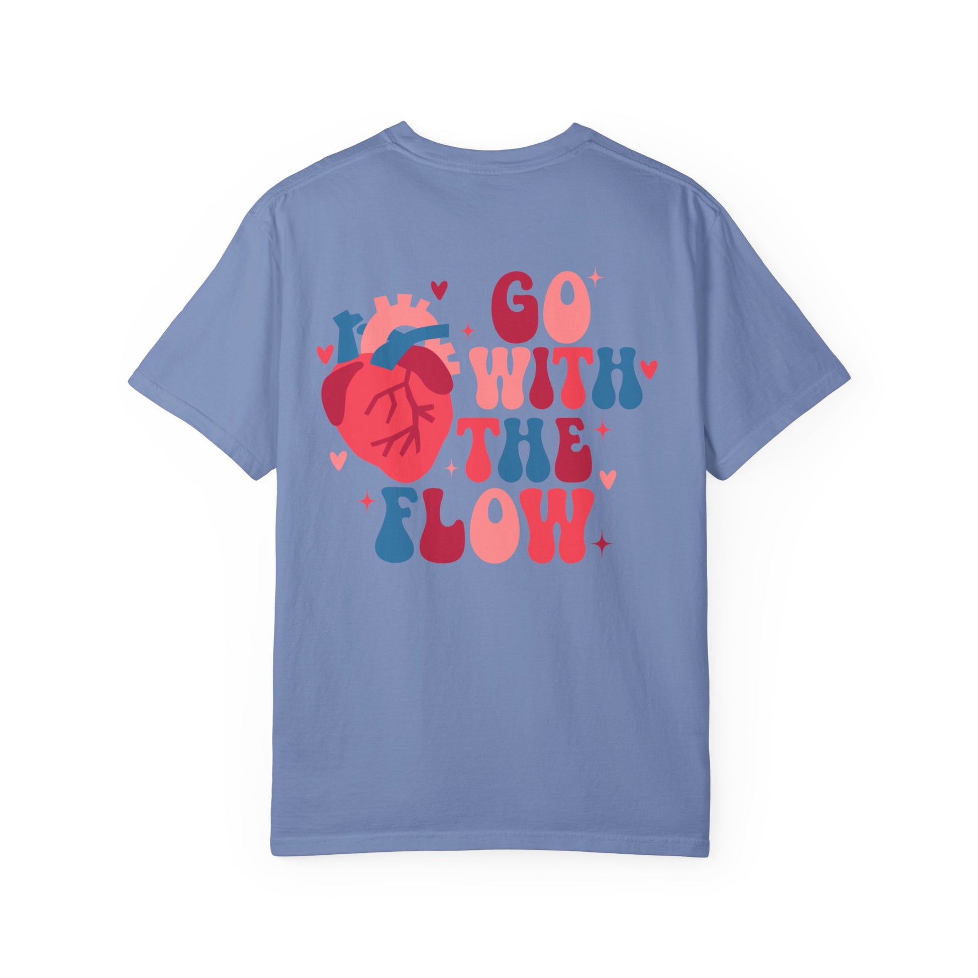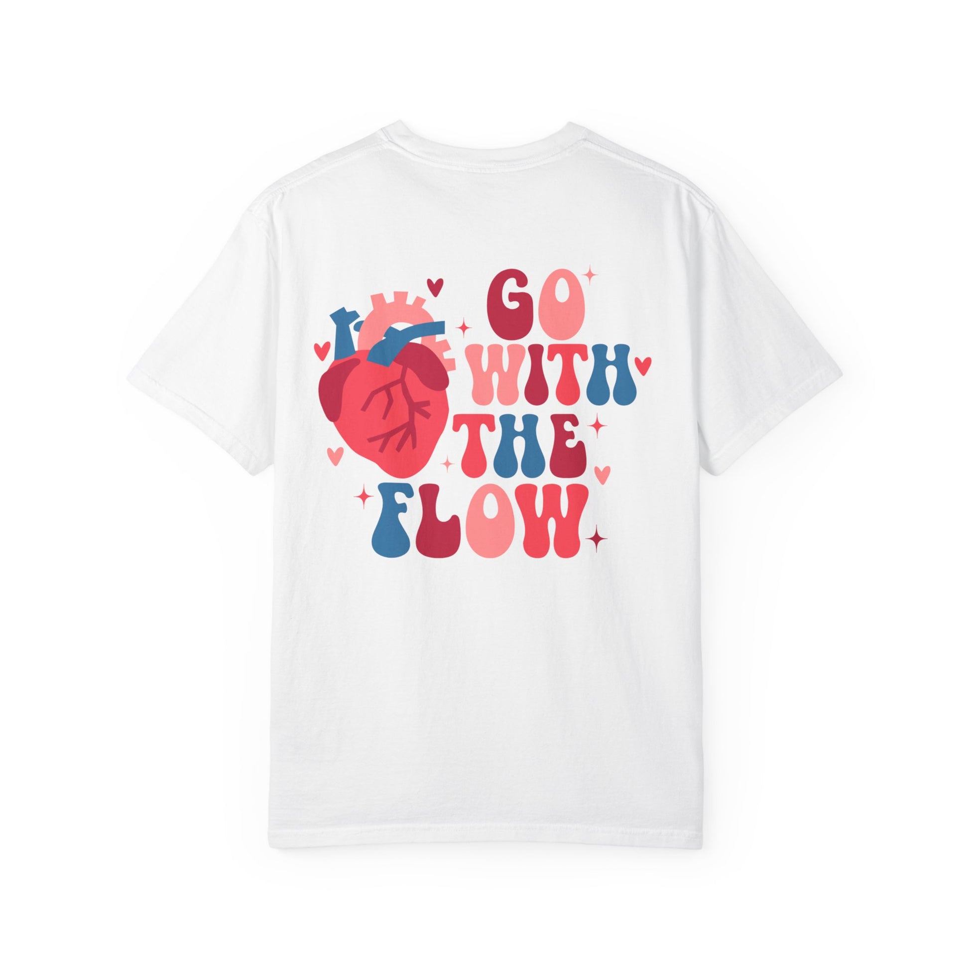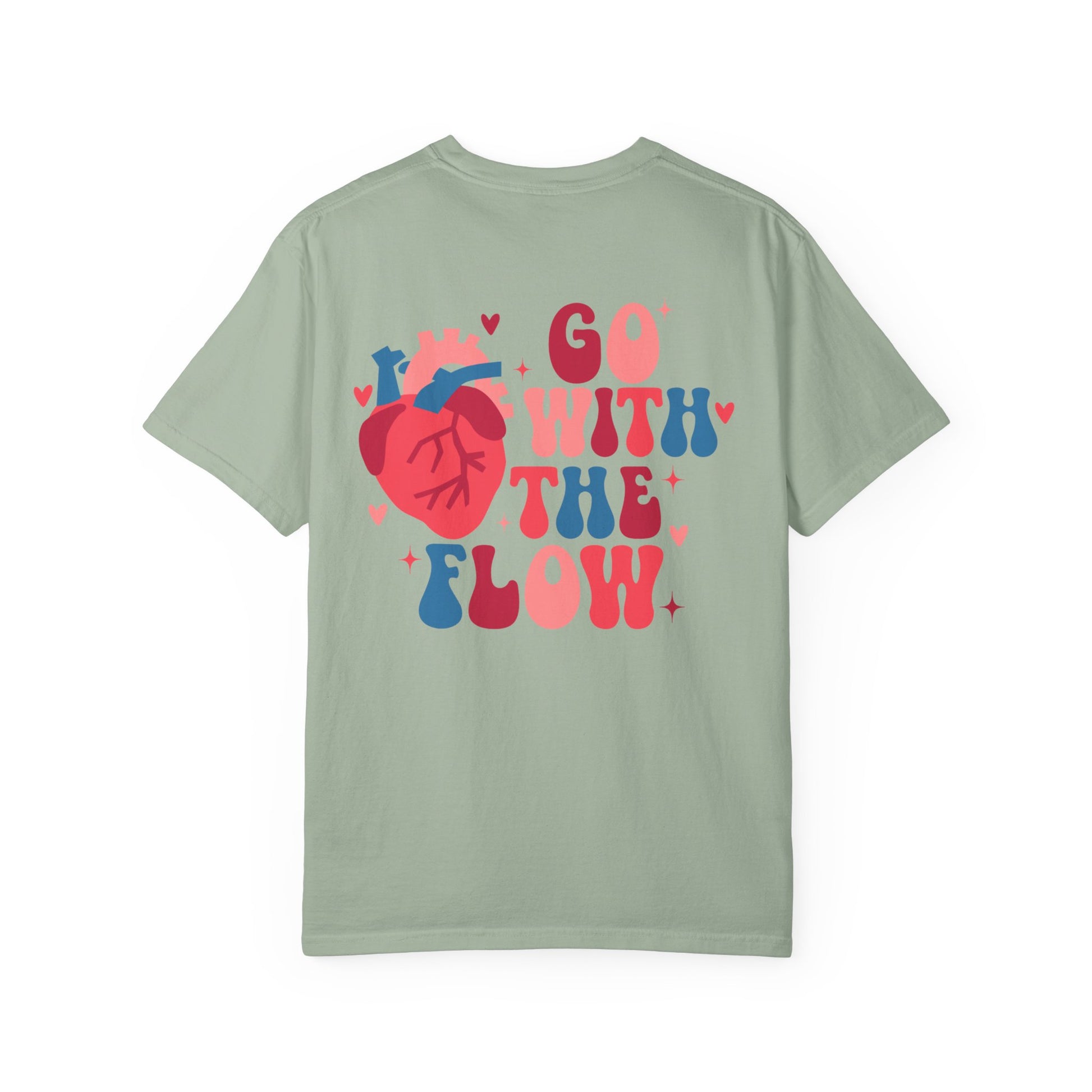 This heavyweight garment-dyed tee brings relaxed comfort and bold personality together. The soft, lived-in color and slightly vintage texture wrap around a playful graphic: an anatomical heart paired with chunky, groovy lettering that reads “Go With The Flow.” It sits small on the chest and larger across the back for a subtle front detail and a statement on the reverse. Wear it loose over scrubs or layered under an open jacket.The durable double-needle seams and pre-shrunk ring-spun cotton mean the color and fit keep their character wash after wash. With a roomy, relaxed cut and a sewn-in label, this tee becomes the one you reach for when you want comfort that still speaks your vibe.