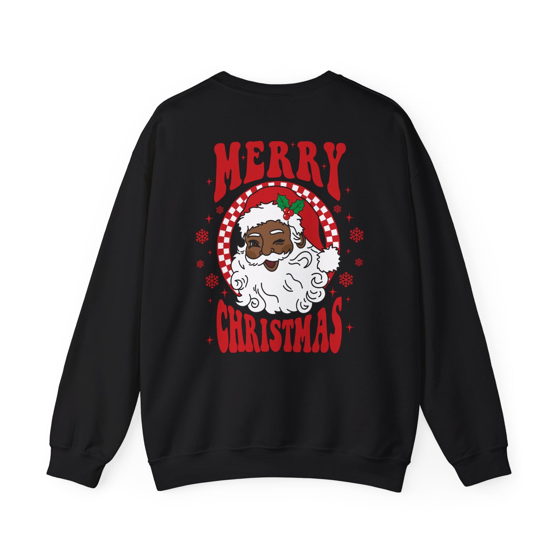 A cozy, soft crewneck sweatshirt with a joyful, soulful twist on classic holiday cheer. The front carries a small, smiling Santa portrait over the heart; the back opens up with a larger, vintage-inspired ‘Merry Christmas’ design that mixes warm red tones, holly accents, and playful snowflakes. It feels like wrapping yourself in holiday spirit — relaxed, familiar, and a little nostalgic. Built to last, it keeps its shape and stays comfortable through long nights of caroling, cocoa, and family stories. Wear it to bring warmth and a bright smile to holiday gatherings, tree-lighting strolls, or slow mornings by the fire.
