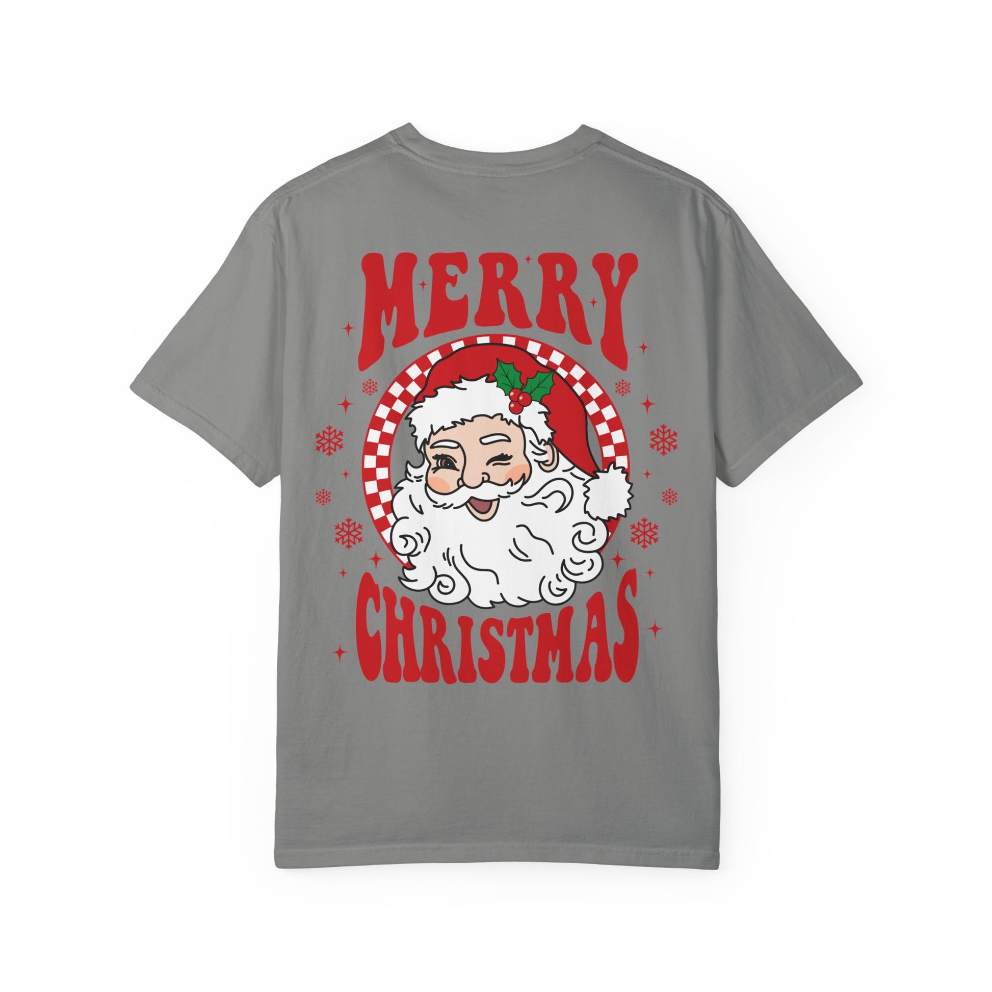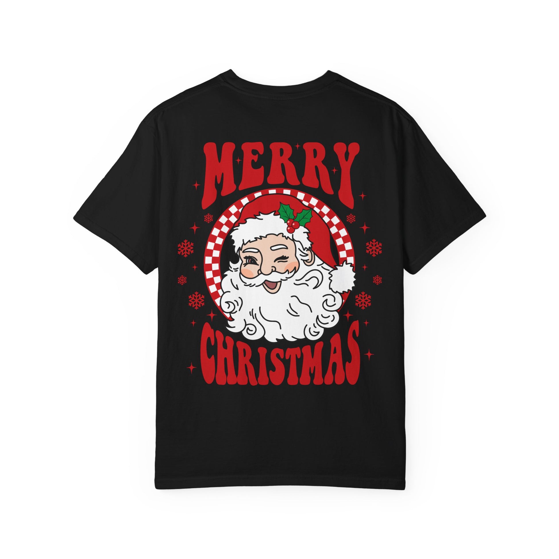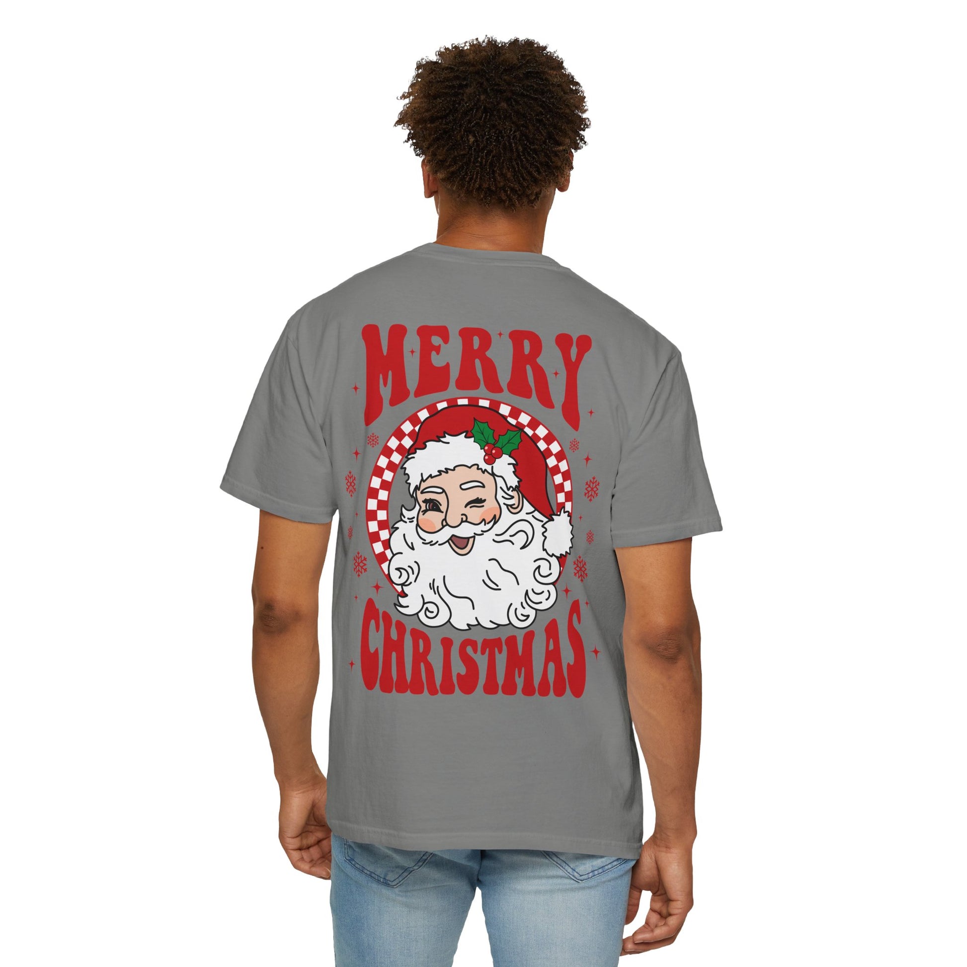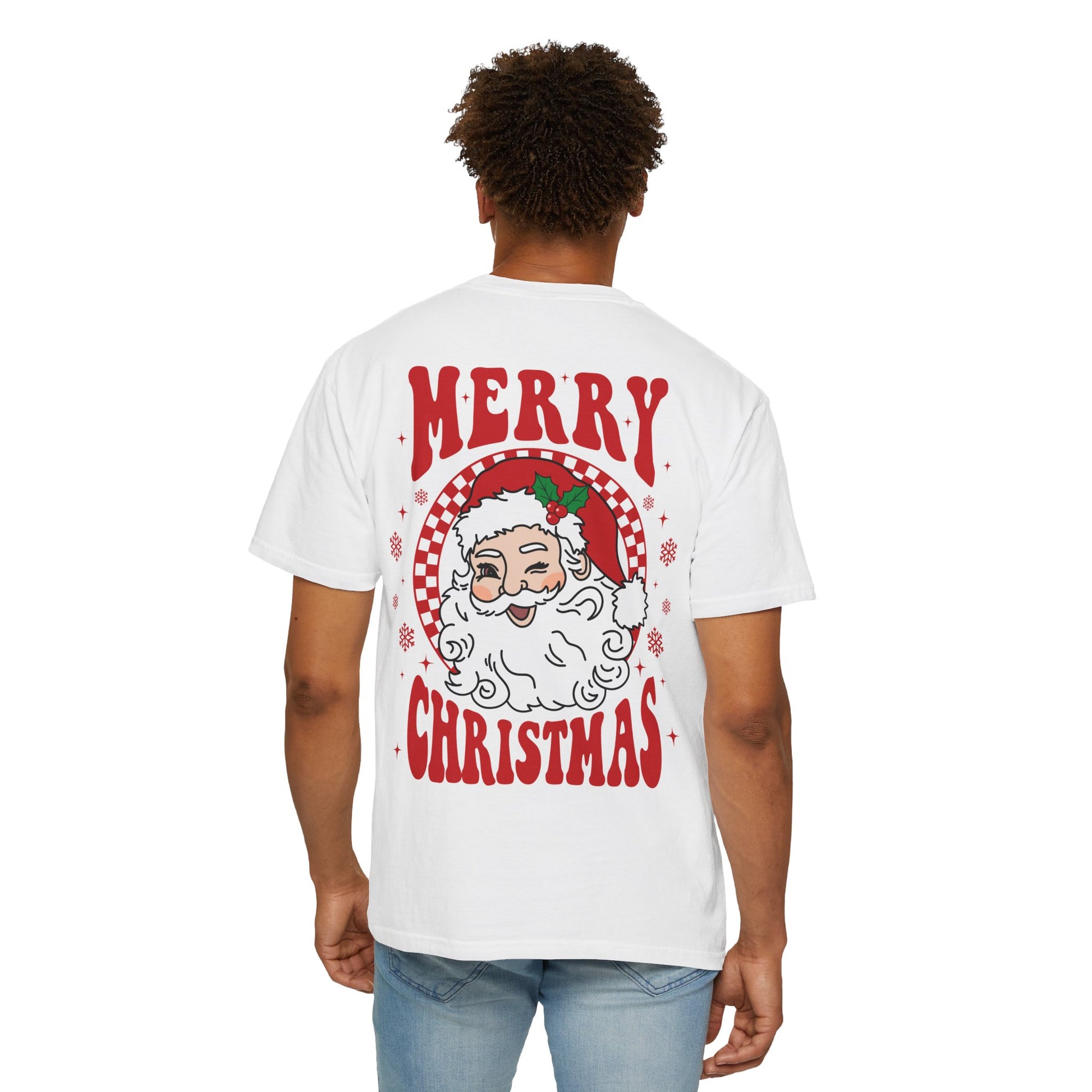 This soft, garment-dyed tee brings a warm, nostalgic take on holiday cheer. A cheerful vintage-style Santa smiles from the chest pocket and spreads a retro “Merry Christmas” message across the back in bold, hand-drawn lettering. The relaxed fit and washed-in color make it feel like a favorite right away — the kind of shirt you reach for when wrapping gifts, sipping cocoa by twinkling lights, or joining friends for a neighborhood carol. Subtle distressing from the post-dye finish and the sewn-in label add artisanal character, while the medium-weight cotton keeps it sturdy through seasonal wear.