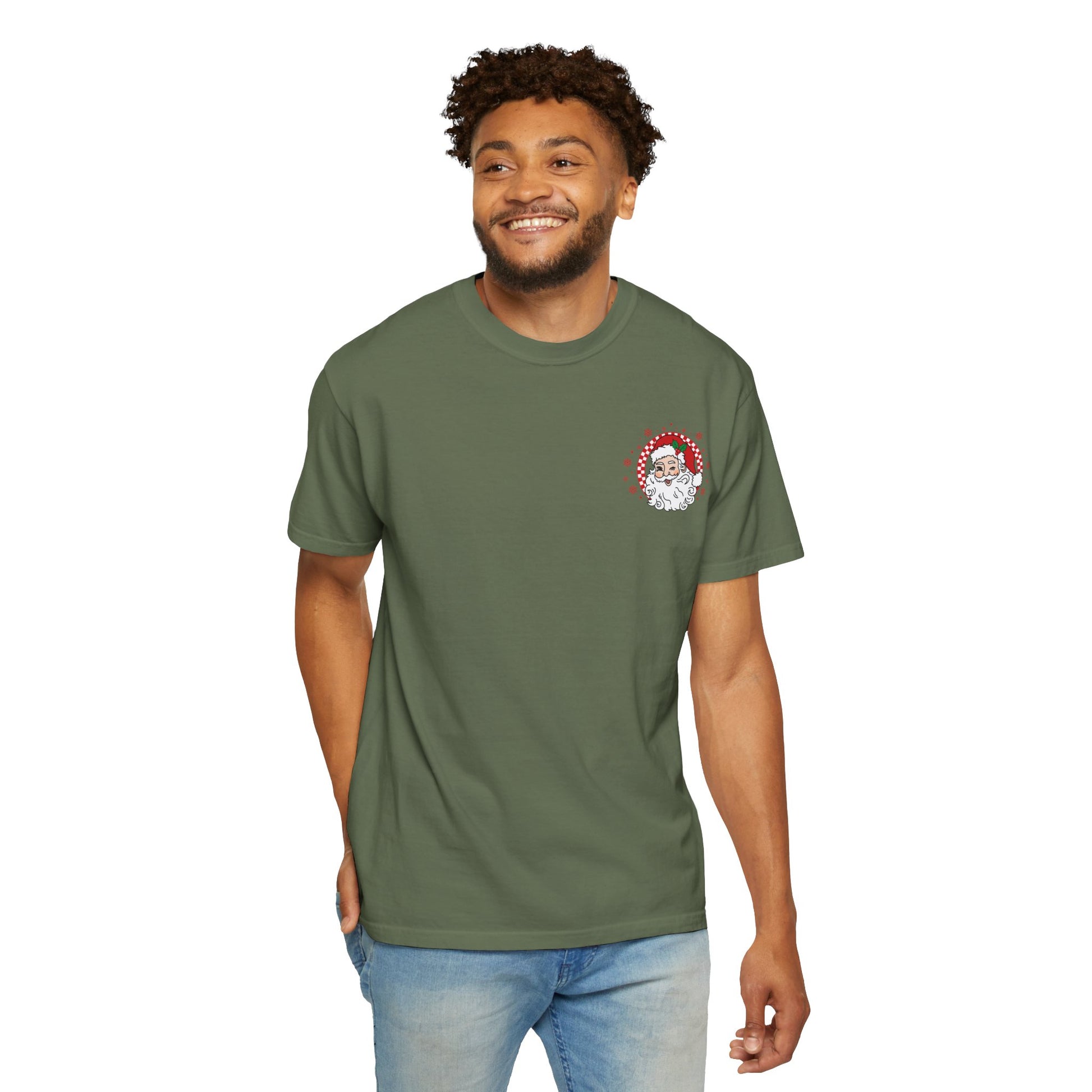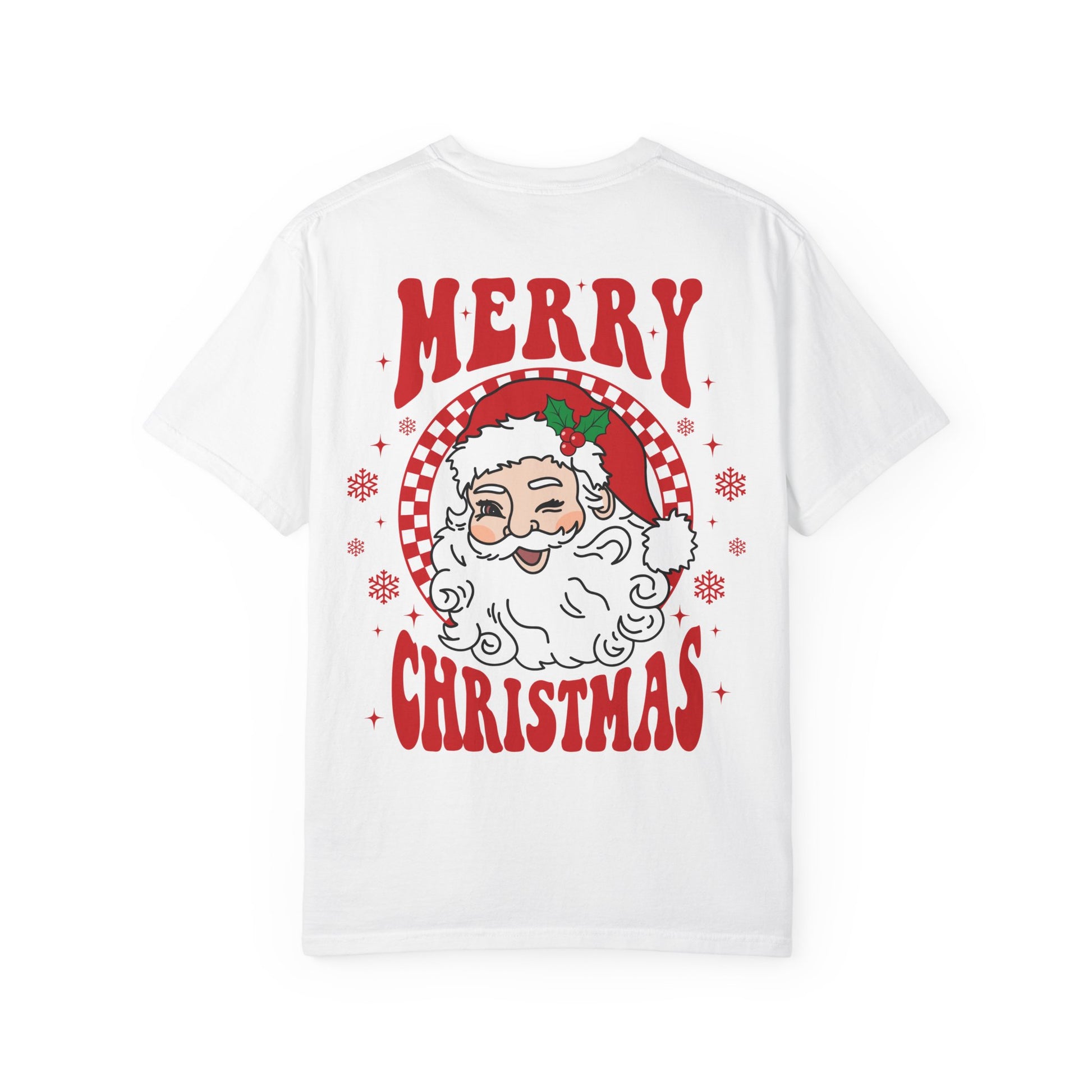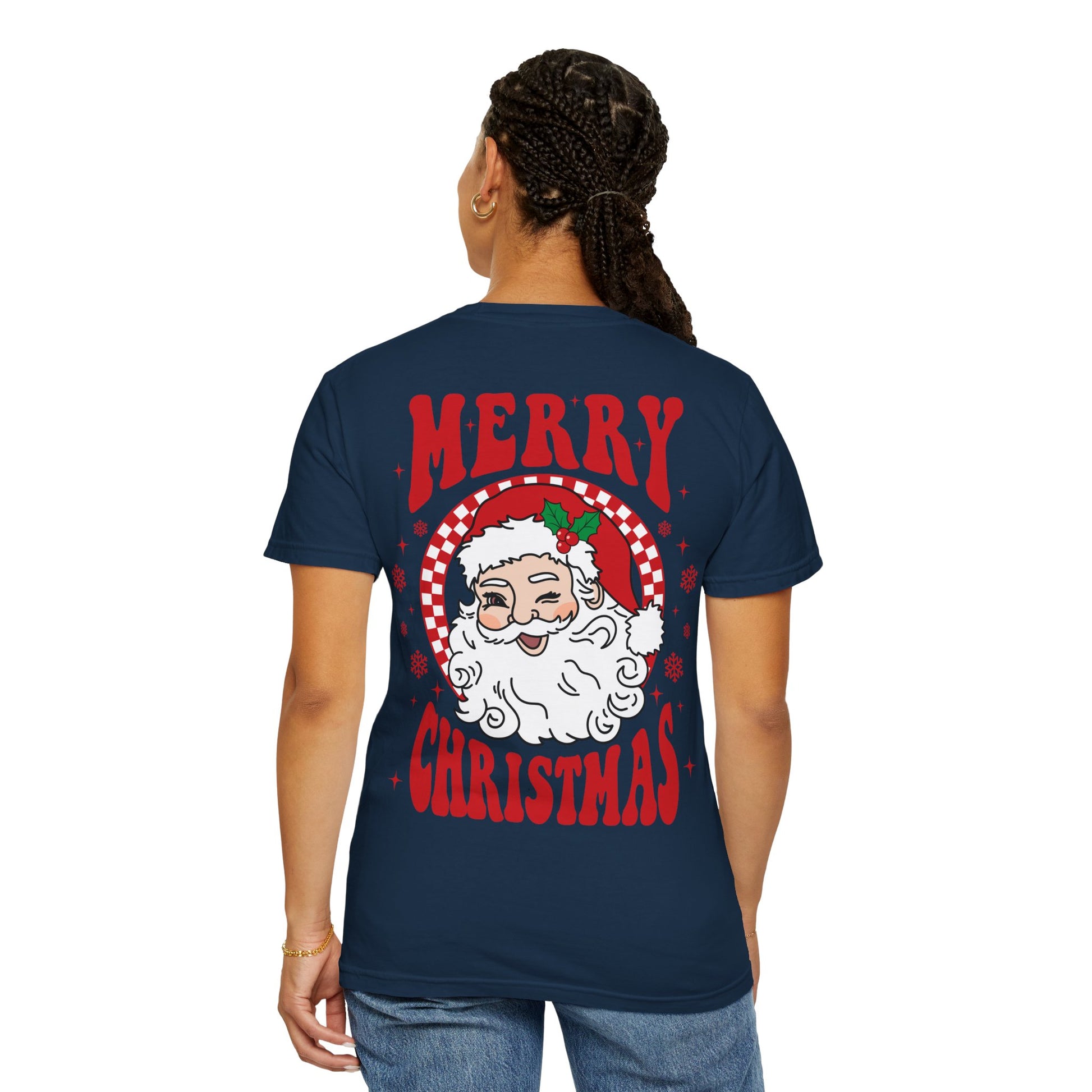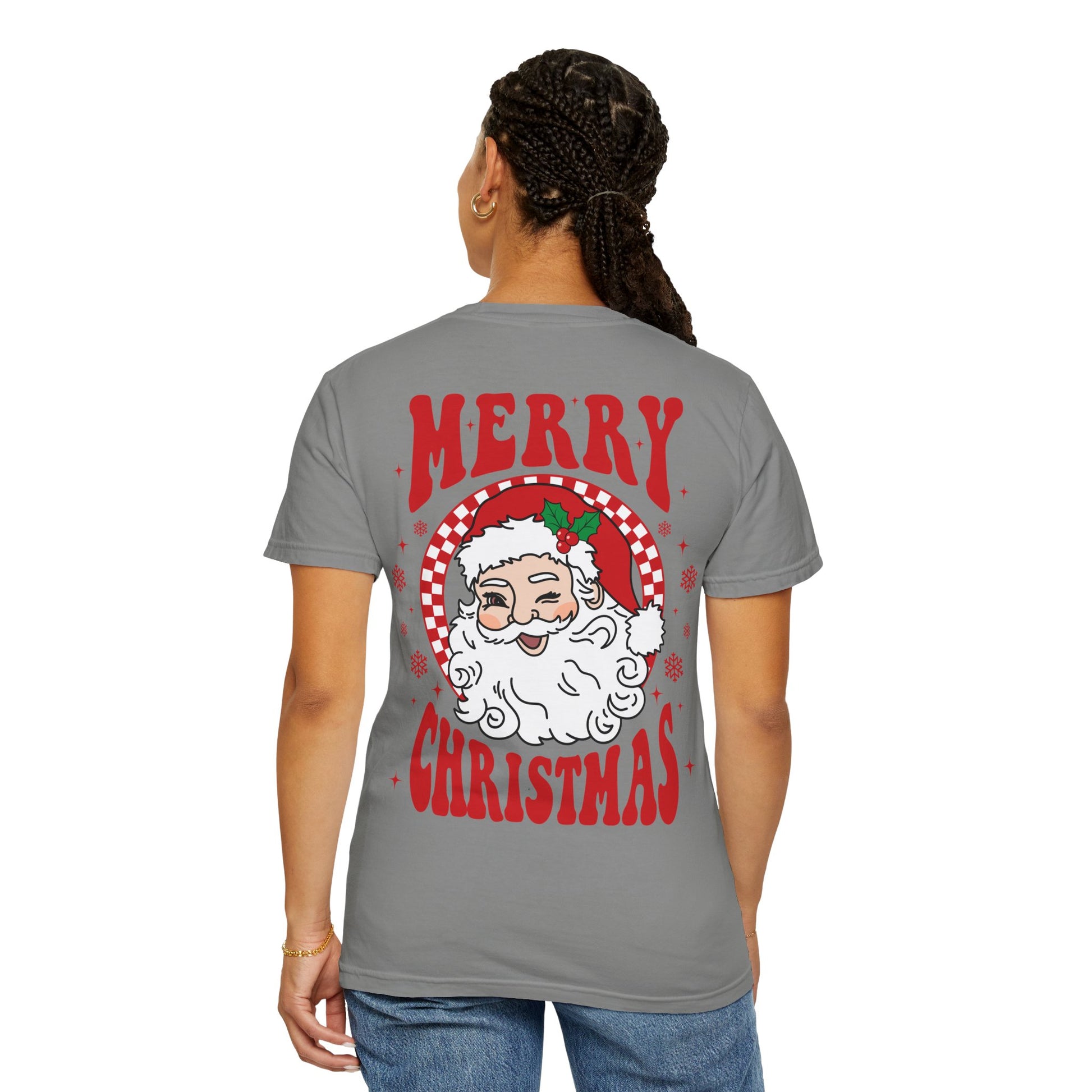 This soft, garment-dyed tee brings a warm, nostalgic take on holiday cheer. A cheerful vintage-style Santa smiles from the chest pocket and spreads a retro “Merry Christmas” message across the back in bold, hand-drawn lettering. The relaxed fit and washed-in color make it feel like a favorite right away — the kind of shirt you reach for when wrapping gifts, sipping cocoa by twinkling lights, or joining friends for a neighborhood carol. Subtle distressing from the post-dye finish and the sewn-in label add artisanal character, while the medium-weight cotton keeps it sturdy through seasonal wear.