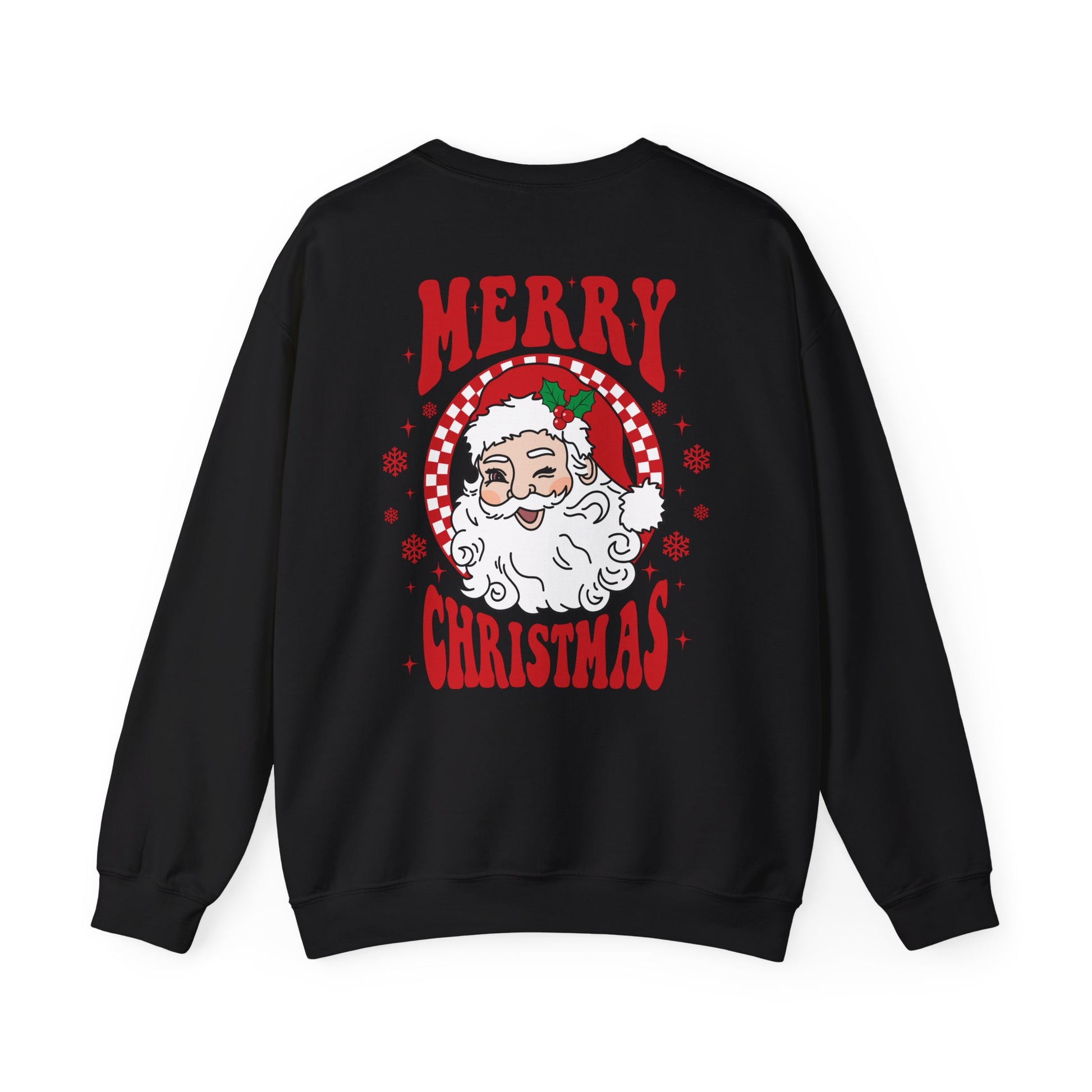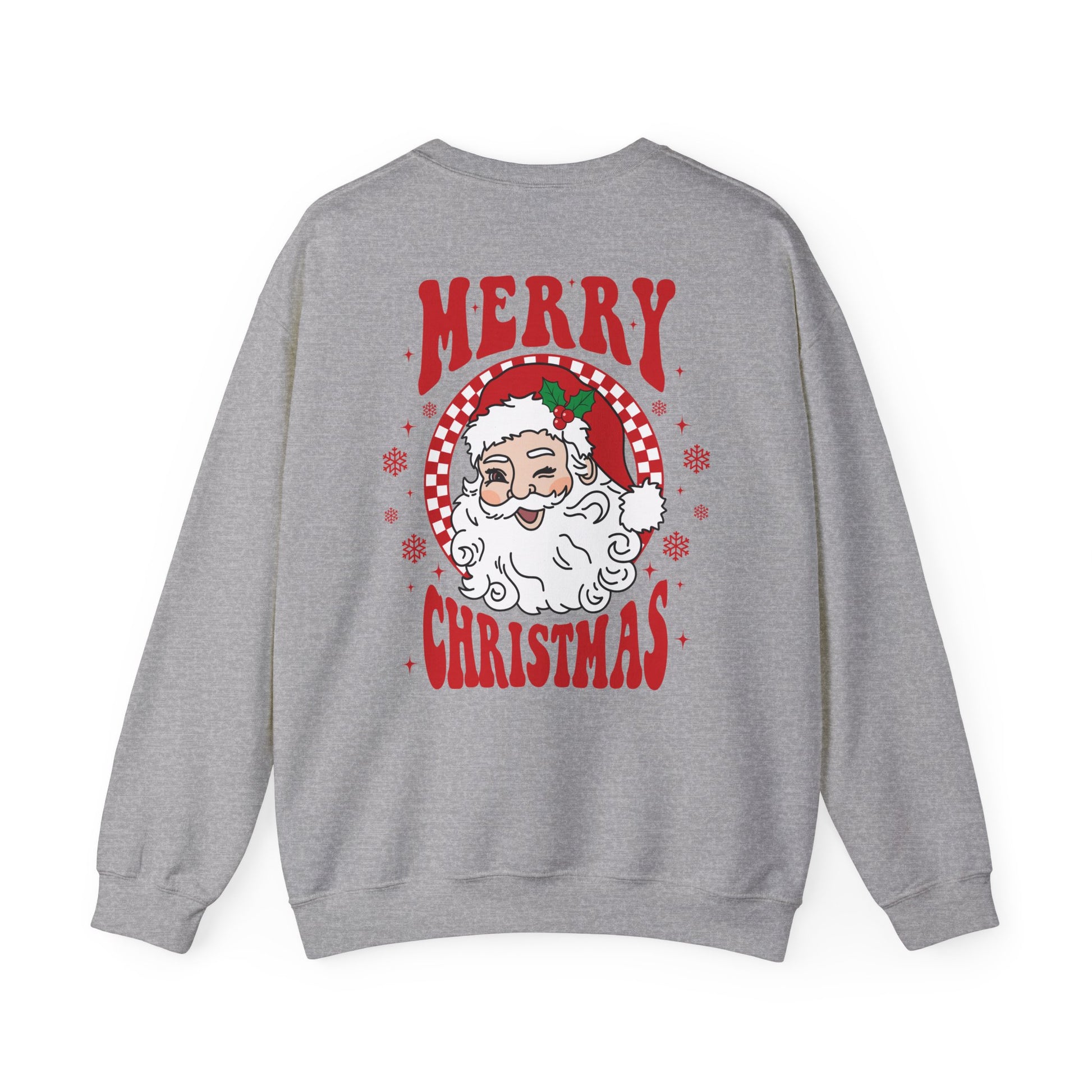 This cozy crewneck brings a warm, nostalgic holiday vibe to chilly nights. Soft, mid-weight fabric and a relaxed, classic fit make it easy to throw on after a long day of decorating or while sipping cocoa by the tree. The front carries a small, cheerful Santa motif over the heart; the back proudly displays a vintage-inspired “Merry Christmas” graphic framed by festive holly and snowflake accents. It feels lived-in from the first wear — comforting, quiet, and a little bit playful — the kind of sweater you reach for when you want to lean into holiday spirit without shouting for attention.
