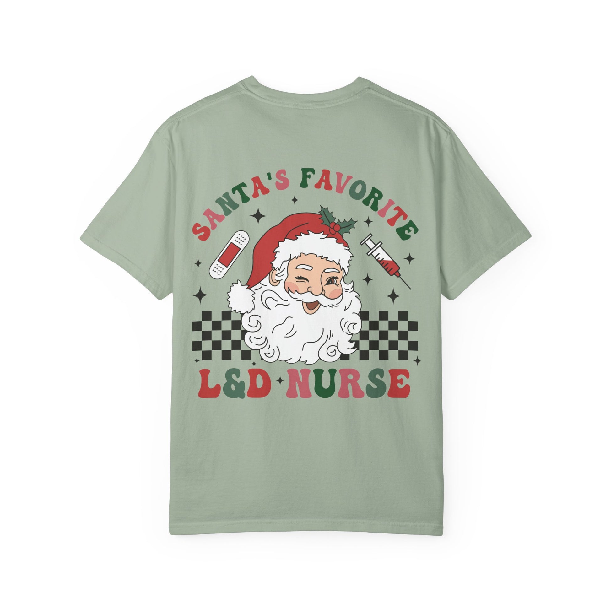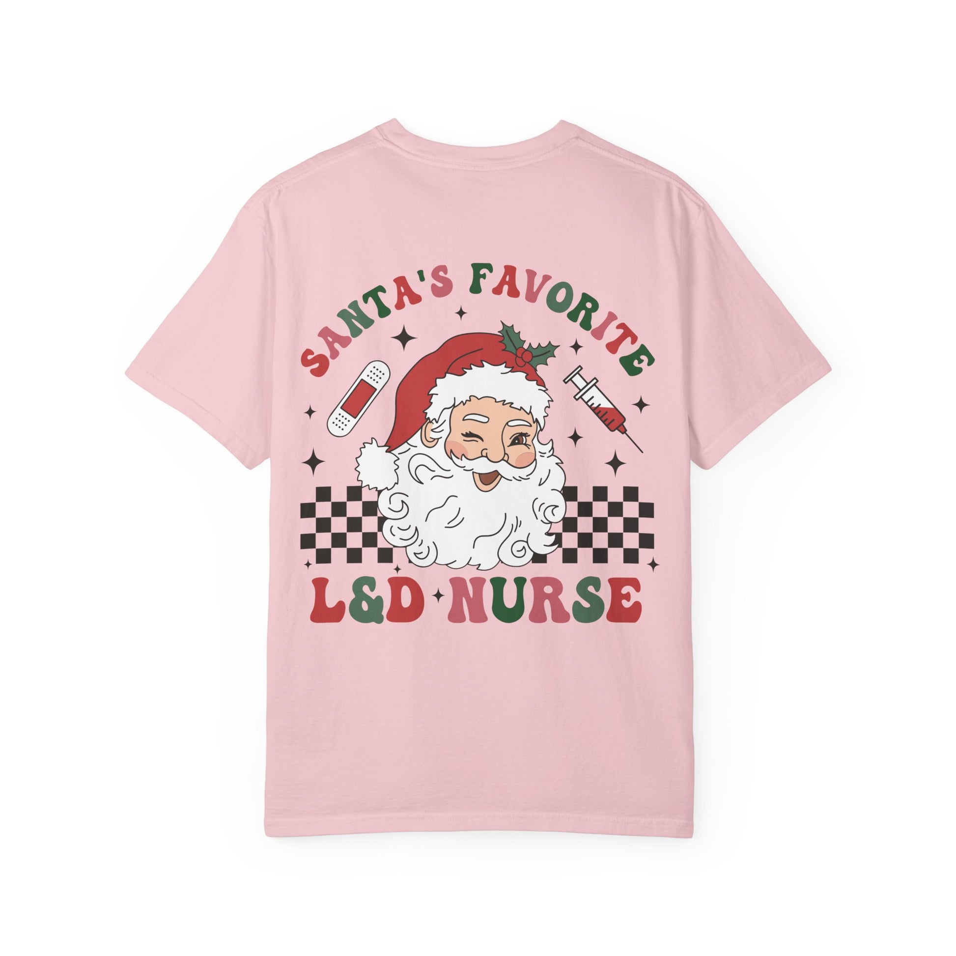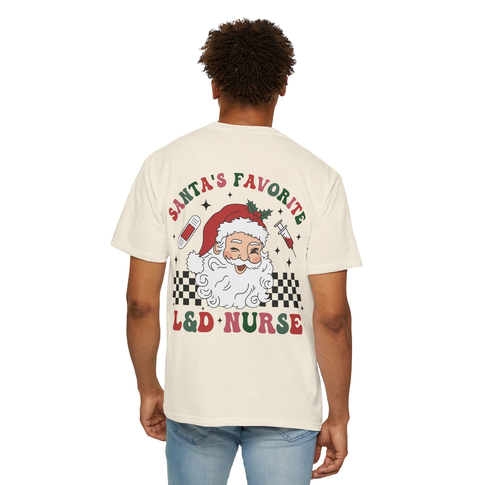 Soft, lived-in tee with a playful holiday heart. This relaxed, garment-dyed cotton shirt carries a cheeky nod to labor & delivery nurses — a vintage-style Santa, tiny syringes and baby bottle icons, and bold “L&D Nurse” lettering that reads like a patch of pride. The fabric feels worn-in from the first wear: breathable, medium-weight cotton that drapes easily over scrubs or casual layers. It’s the kind of shirt you reach for when you want to show some seasonal spirit without shouting — cozy, practical, and quietly celebratory.