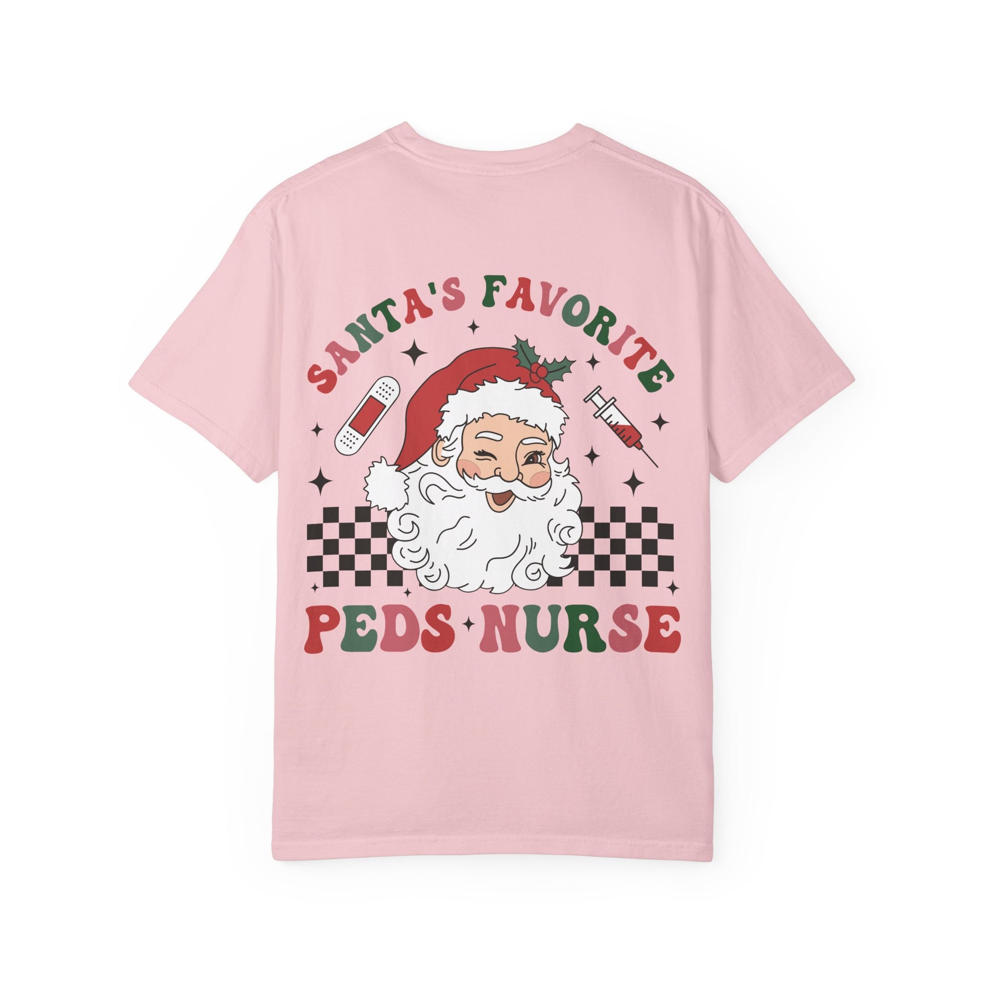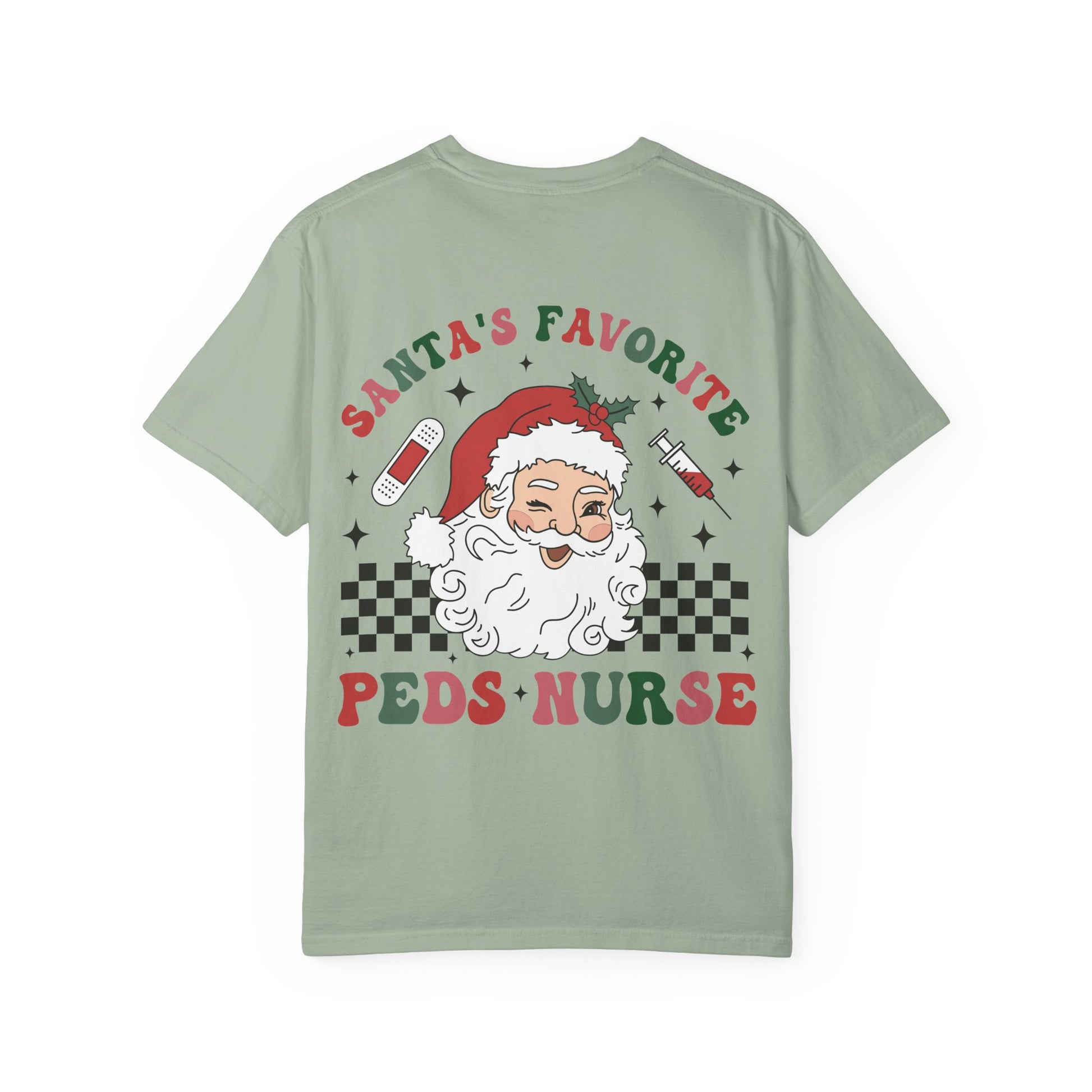 This relaxed-fit garment-dyed tee brings a warm, playful spirit to pediatric nurses who work through the holiday season. Soft, washed cotton drapes comfortably during long shifts, while the back art — a jolly Santa face framed by nursing icons and checker accents — adds a cheeky, festive touch that makes coworkers and little patients smile. The small chest text keeps the front subtle and professional; the larger back graphic lets you celebrate your role with humor and heart. Wear it between rounds, at unit holiday gatherings, or on days when a little extra cheer helps everyone breathe easier.